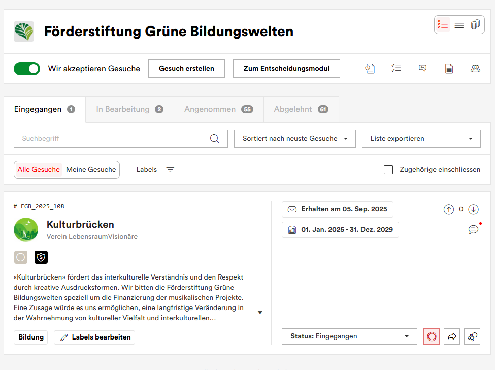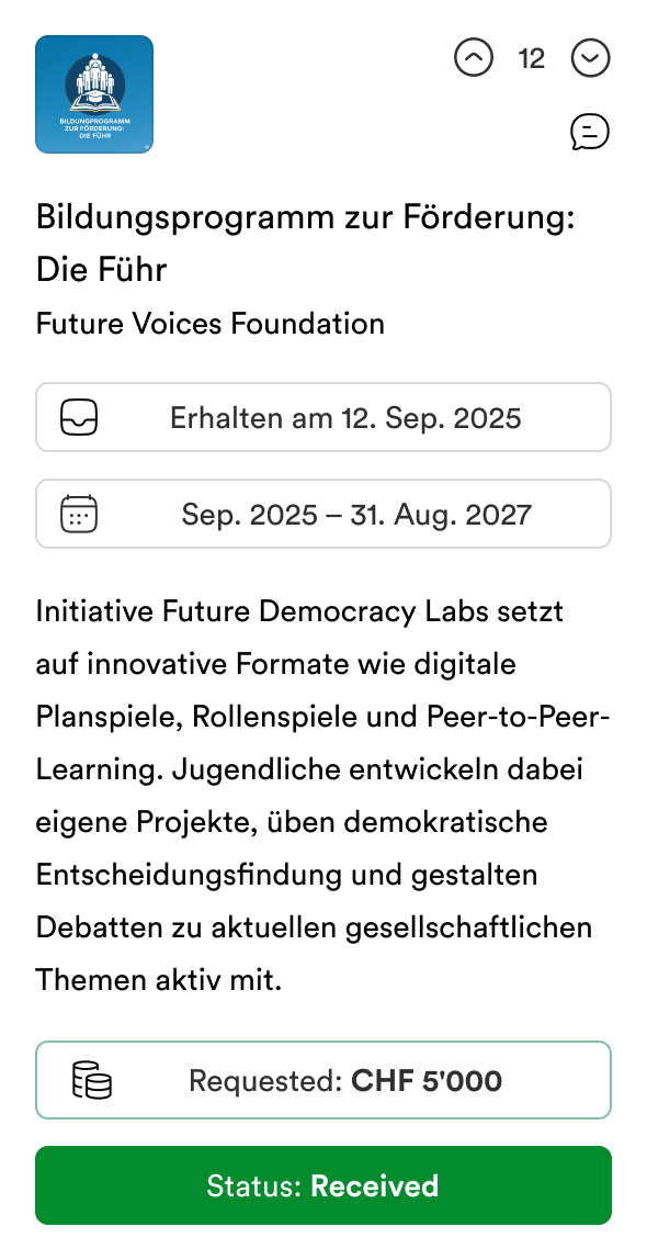 Als Nonprofit legen Sie Organisations- und Projektprofile einmal sorgfältig an und nutzen diese anschliessend für verschiedene Anfragen. Funder erhalten zusätzliche Kontextinformationen für fundierte Entscheidungen. Für beide Seiten werden Förderprozesse einfacher und effizienter.