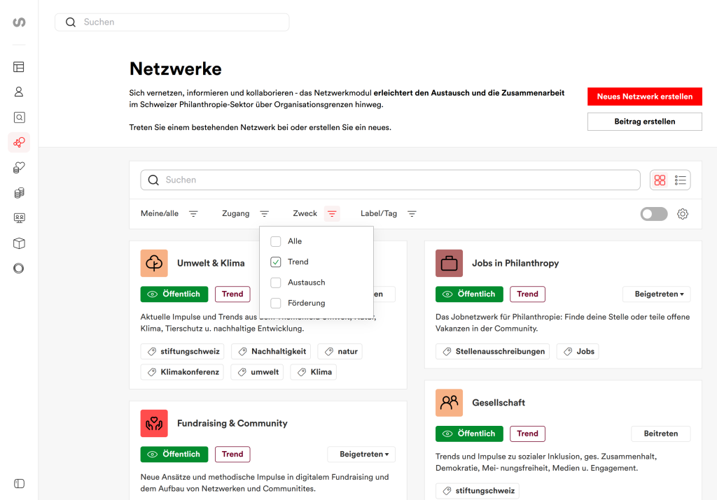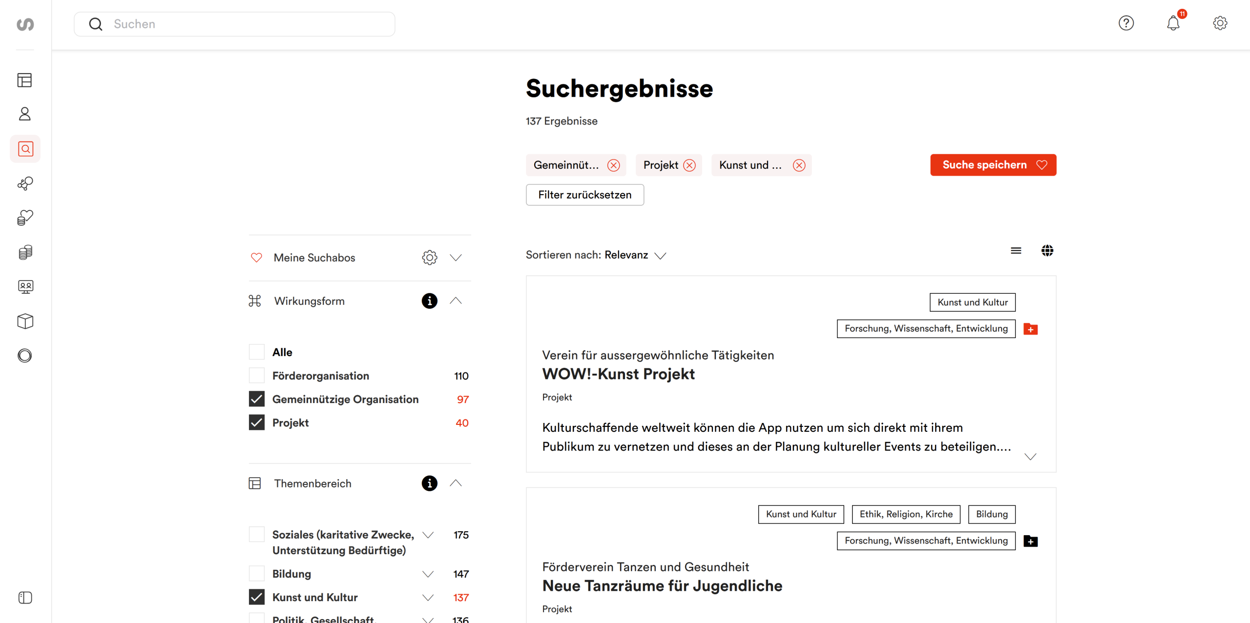 Finden Sie mit intelligenten Such- und Filterfunktionen gezielt passende Förderquellen und Projektpartner. Präzise Suchabos und professionelle Werkzeuge unterstützen Sie beim nachhaltigen, wirkungsvollen Aufbau eines institutionellen Fundraisings.