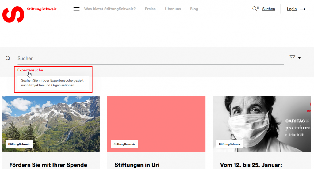 Bisher konnten Sie mit der Suchfunktion nur nach Organisationen, Projekten, Projektausschreibungen, Personen und Veranstaltungen auf spheriq.ch suchen. Jetzt steht Ihnen auch eine allgemeine Suchfunktion zu Verfügung. Bei dieser werden Ihnen alle Artikel auf unserer Webseite zu Ihrem eingegebenen Suchbegriff angezeigt. Die Suchfunktion mit der Sie gezielt nach Organisationen und Projekten suchen können, heisst nun «Expertensuche». Sie gelangen zu beiden Suchfunktionen mit Klick auf «Suchen». Dort können Sie zwischen der allgemeinen Suche und der Expertensuche auswählen.