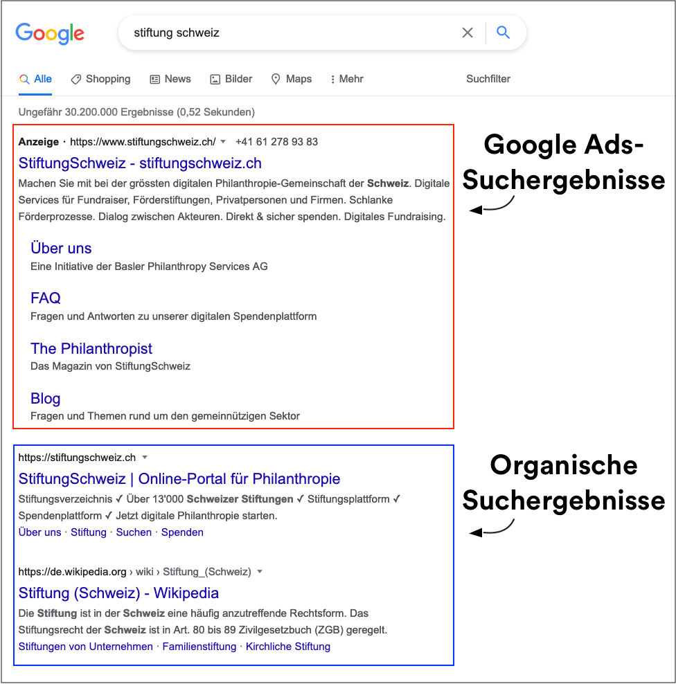 Google-Anzeigen spielt hingegen das Google Ads- bzw. das Google Ad Grants-Programm aus. Google Anzeigen, wie auch Anzeigen andere Suchmaschinen (Bing, DuckDuckGo etc.) sind dem Kanal der Suchmaschinenwerbung zuzuorden, englisch auch Search Engine Advertising (SEA) genannt. Google Ads-Suchergebnisse führen die Suchenden über einen Klick auf die Anzeige zum passenden Ziel: der Landingpage. Wichtig zu wissen: Anzeigen über Google Ad Grants werden immer unter den Anzeigen von Google Ads angezeigt. Ein Grund, warum Organisationen neben Grants auch das generelle Ad-Programm nutzen.