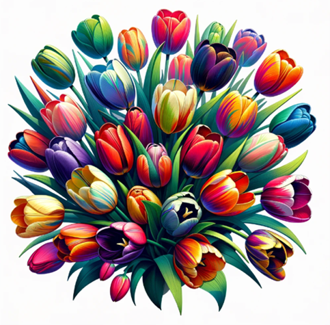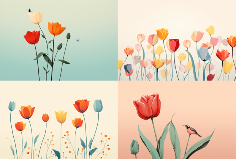 Prompt in Midjourney: /imagine simplified illustration, bouquets of flowers, focus on colorful tulips, very detailed, bird’s eye view -v 5.0 -ar 16:9 , Simple minimal, –ar 3:2