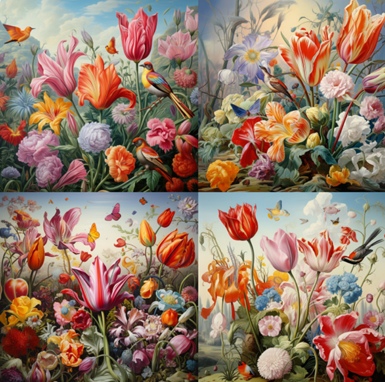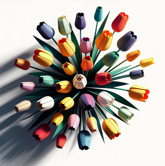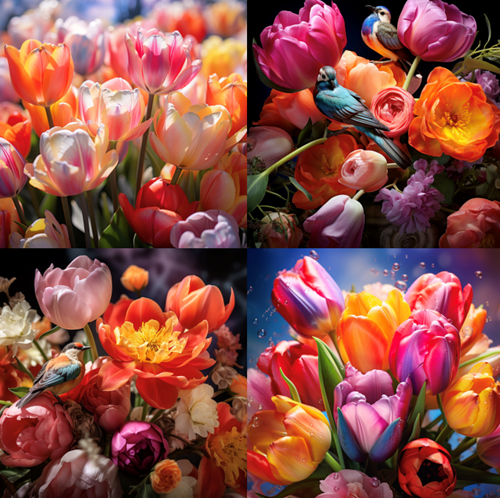 Prompt in Midjourney: /imagine bouquets of flowers, focus on colorful tulips, very detailed, bird’s eye view -v 5.0 -ar 16:9, 8k, photography