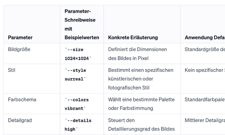 Prompt for ChatGPT: Please create a table with important information for a midjourney promotion so that I can create the desired images. Please list the 10 most important parameters. Insert in the respective column per parameter: Parameter Parameter notation with example values Specific explanation Application Default.