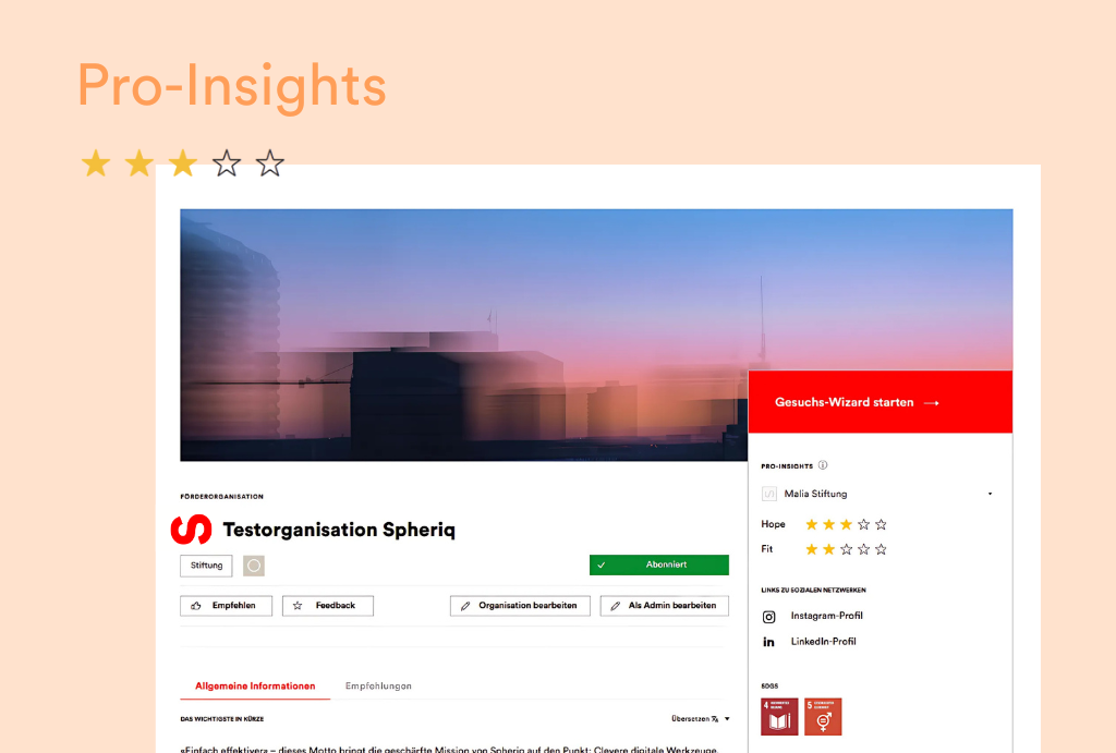 – 5 stars (perfect fit): Topic, region and target group match as far as possible. Example: A foundation promotes projects in the field of environmental protection in Switzerland with children as the target group. A project that offers nature experiences for children in Zurich achieves the maximum fit here.