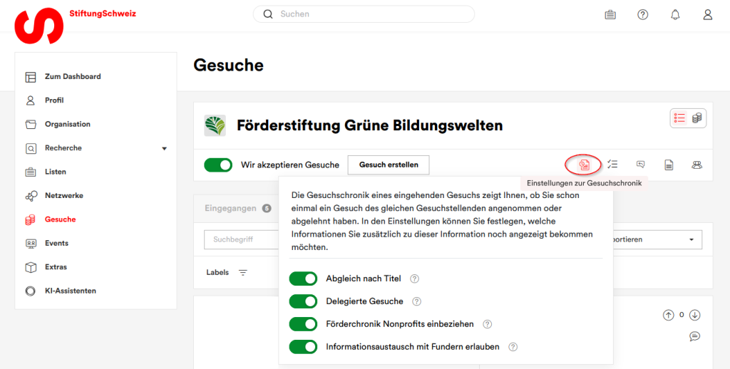 You can set yourself what exactly should be displayed in the request history. In the settings, you can determine whether applications with the same title, delegated applications and entries in the applicant nonprofit’s funding history should also be displayed. You can also join the exchange of information with other funding organizations. If both your own organization and another funding institution have activated this function, it will be displayed whether an organization has already submitted an application to the other organization – and if so, whether it has been approved or rejected. This new feature gradually makes it easier to update the funding status and helps funders to make informed decisions.