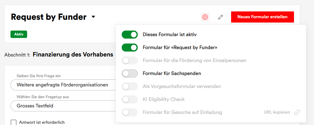 3. create a new form and select “Form for “Request by Funder”” in the settings: