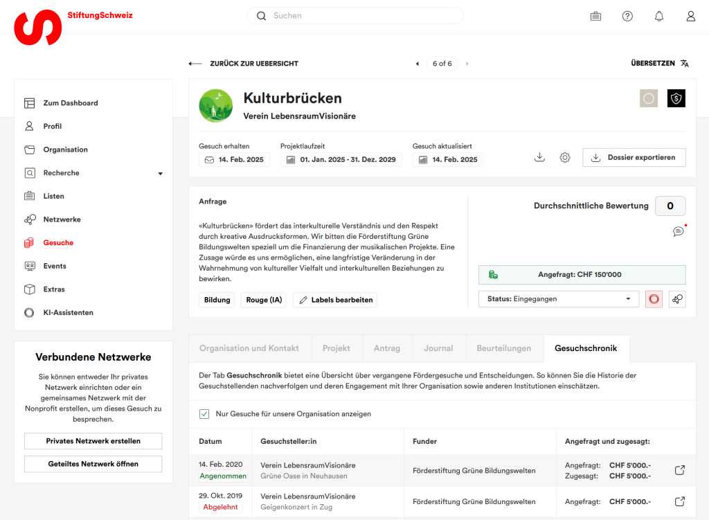 With the new release, the request history is now also displayed for each application. Funders now have a detailed overview of all previously submitted applications and other funding for the respective organization/applicant. The request history is displayed for each application in the detailed view: