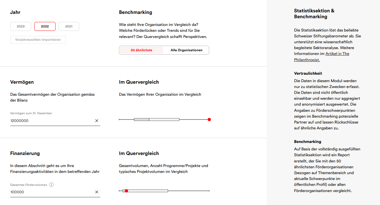 Benchmarking in the statistics panel gives you a comprehensive impression of where your organization stands in comparison – be it in relation to all nonprofits or funders, or in comparison with the 50 organizations that are closest to you thematically.