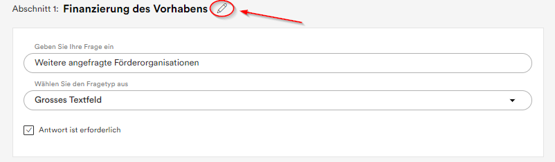 Jeder der drei Abschnitte des Formulars hat schon eine hinterlegte Überschrift. Um diese anzupassen, klicken Sie auf den Stift rechts neben der Überschrift, geben die gewünschte Überschrift ein und klicken Sie «Enter» oder auf «Speichern», um Ihre Eingabe zu speichern.