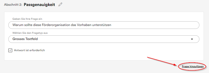 Um eine neue Frage hinzuzufügen, klicken Sie bei dem entsprechenden Abschnitt auf «Frage hinzufügen».