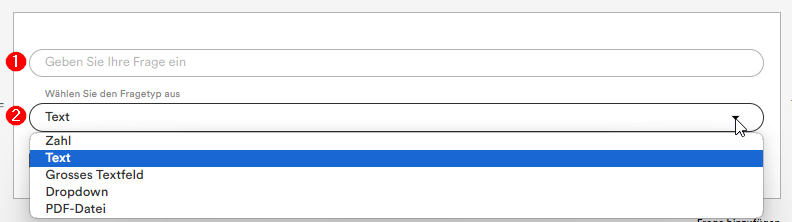 Geben Sie anschliessend Ihre Frage ein. Bei «Fragetyp» können Sie auswählen, ob die Gesuchstellenden als Antwort eine Zahl oder einen Text eingeben, aus einem Dropdown eine Option auswählen oder eine PDF-Datei hochladen sollen. Zudem können Sie mit Klick auf die Checkbox die Antwort der Gesuchsstellenden als erforderlich markieren. Gesuchsstellende können das Gesuch dann nur abschicken, wenn sie bei dieser Frage eine Antwort eingegeben oder ein Dokument hochgeladen haben (je nach Fragetyp).