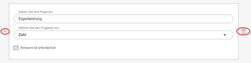 Sie können die Fragen innerhalb eines Abschnittes auch verschieben. Klicken Sie dazu links neben der Frage auf die zwei Striche und ziehen Sie sie an die richtige Stelle. Um eine Frage zu löschen, gibt es das Mülleimer-Symbol auf der rechten Seite der Fragen.