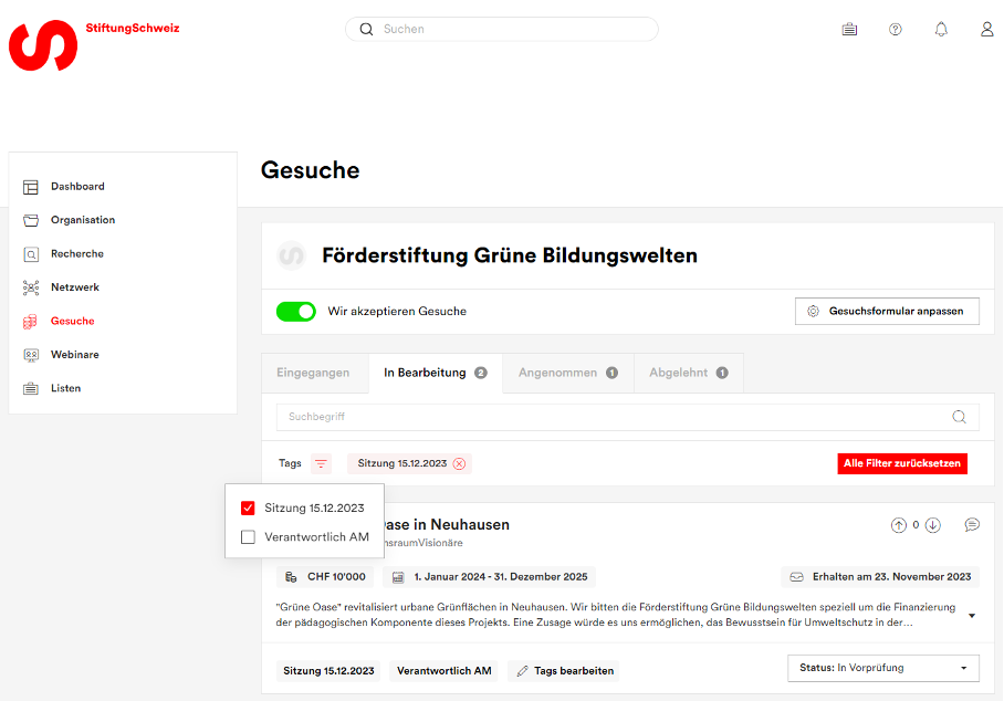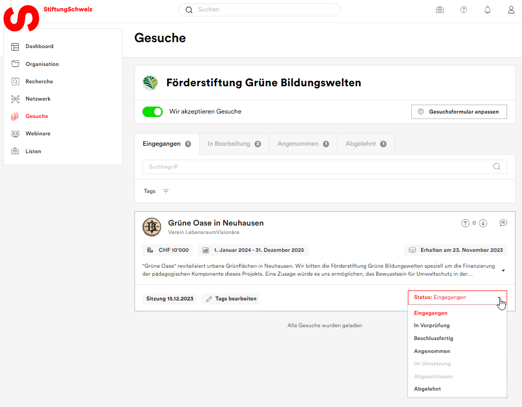 Die Gesuchsübersicht wird Ihnen direkt angezeigt, wenn Sie auf den Menüpunkt «Gesuche» klicken. Hier sehen Sie alle eingegangenen Gesuche nach Status sortiert. Bei jedem Gesuch sehen Sie auf einen Blick, von welcher Organisation das Gesuch für welches Projekt gestellt wurde, den angefragten Betrag, die Projektdauer, die Anfrage sowie den Status.