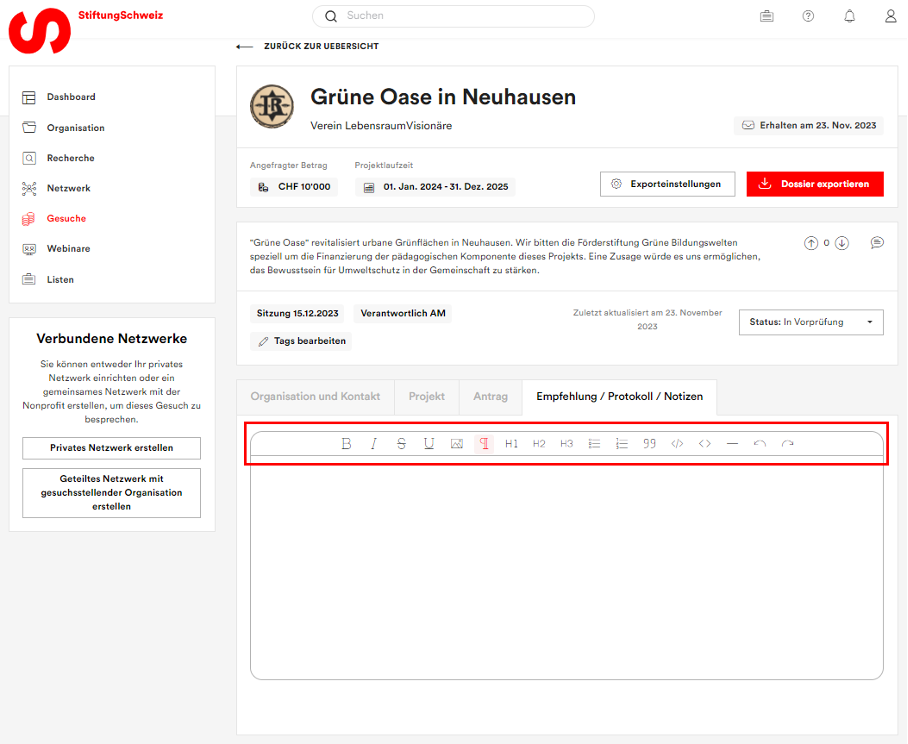 Im Journal können Sie alles Wichtige zu dem Gesuch notieren – Ihre Empfehlung für den Stiftungsrat, Beschlüsse zu dem Gesuch, Notizen zum Verlauf des Projektes usw. Den Text können Sie mit den Funktionen am oberen Rand des Journalfelds beliebig formatieren.