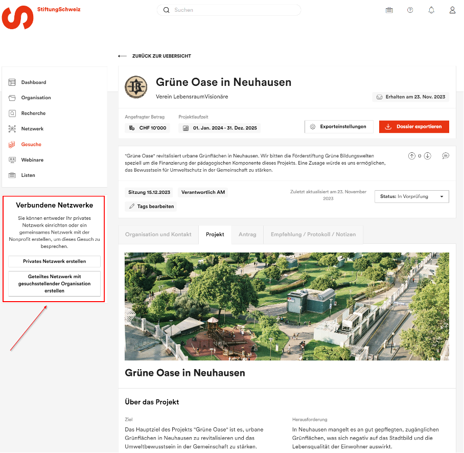 - Ein geteiltes Netzwerk mit der gesuchsstellenden Organisation: Im geteilten Netzwerk nehmen Sie und die gesuchsstellende Organisation teil. Dort können Sie sich mit der gesuchsstellenden Organisation austauschen. Gerade für die Kommunikation während der Förderung eines Projektes bietet sich dieser Netzwerktyp an, da Sie im Netzwerk auch Dokumente und Bilder hochladen können.