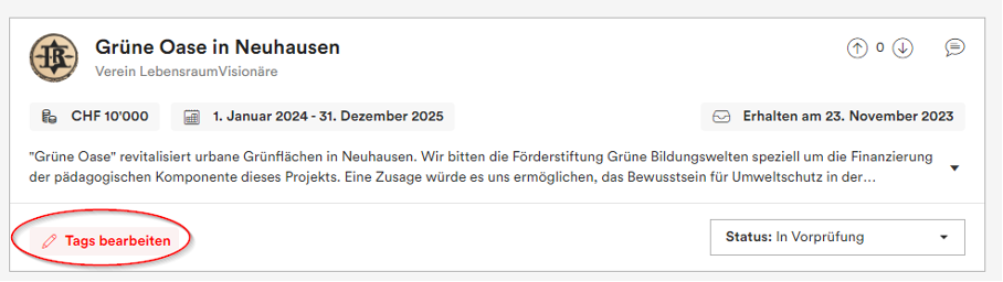 Um die Gesuche verwalten und filtern zu können, verwenden wir ein cleveres Tagging-System. Um ein Tag zu einem Gesuch hinzuzufügen, klicken Sie auf «Tags bearbeiten», geben Sie das Tag in das Textfeld ein und drücken Sie anschliessend «Enter». Fügen Sie so viele Tags hinzu, wie Sie möchten und klicken Sie anschliessend auf «Speichern».