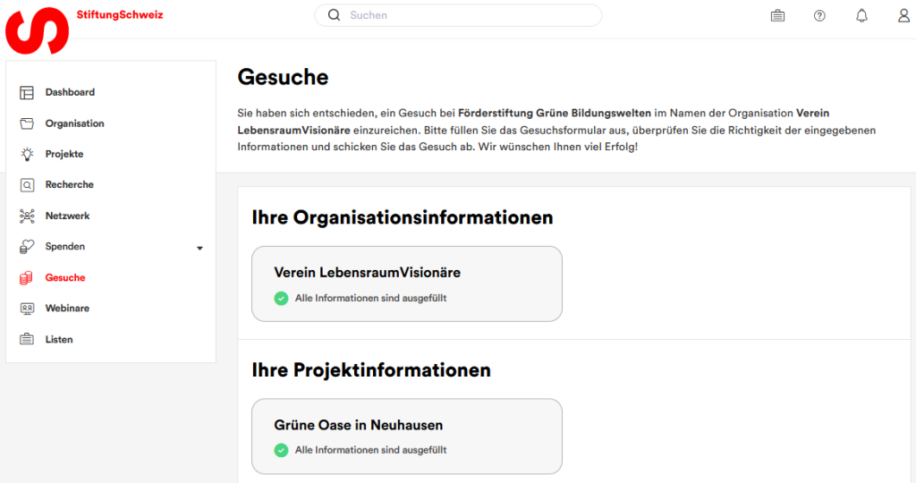 Alle Ihre Gesuche sehen Sie in Ihrer Gesuchsübersicht nach Status sortiert unter dem Menüpunkt «Gesuche». In der Übersicht sehen Sie bei jedem Gesuch auf einen Blick, an welche Organisation das Gesuch für welches Projekt gestellt wurde, den angefragten Betrag, die Projektdauer und die Anfrage sowie den Status.