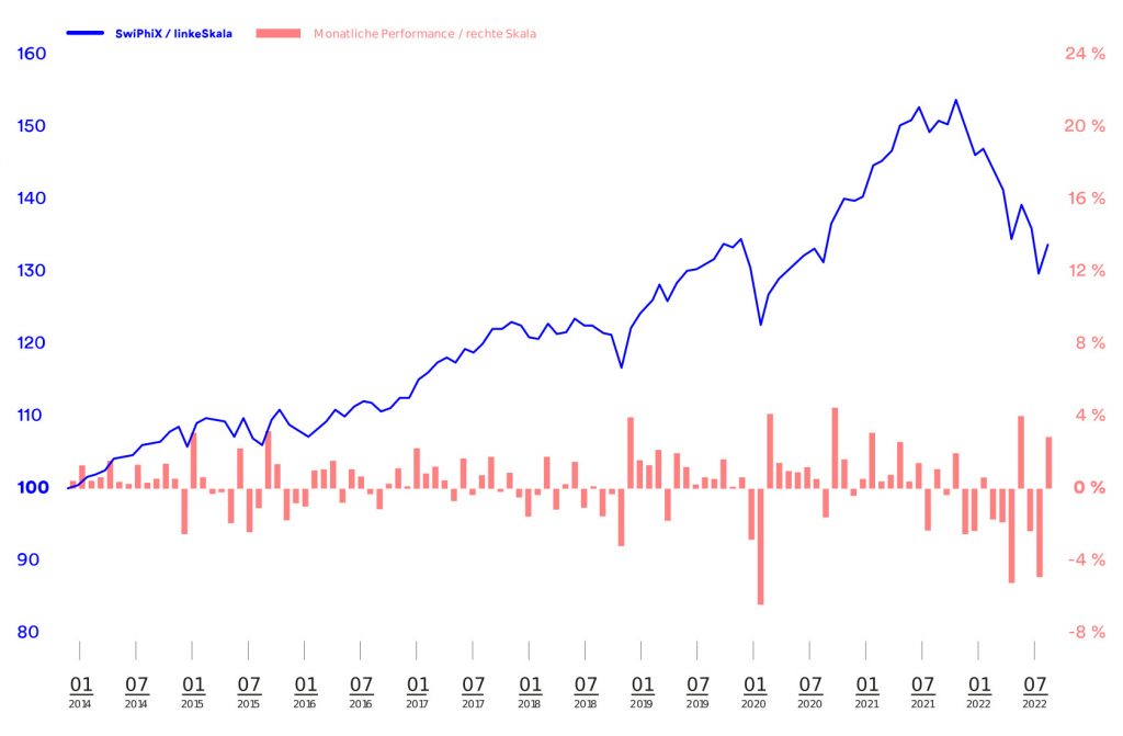 Der Oktober war nach dem Juli der zweitbeste Monat des laufenden Jahres. Der Marktwert der Wertschriftenportfolios der gemeinnützigen Organisationen, die dem Swiss Philanthropy Performance Index zugrunde liegen, stieg um durchschnittlich 2,8 %. Die Spanne der Performance lag zwischen 0,8 % und 5,9 %, das heisst, alle Portfolios verzeichneten einen Gewinn. In der Folge reduzierte sich der im laufenden Jahr kumulierte Verlust auf –13,0 %. Über drei Jahre betrachtet, liegt die kumulierte Performance des durchschnittlichen Portfolios mit 1,2 % wieder im positiven Bereich.