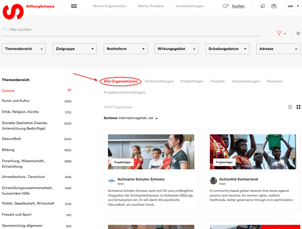 Neu gibt es bei der Suchfunktion den Reiter „Alle Organisationen“. Dort können Sie mit Hilfe unserer Filter nach allen Organisationen in einem bestimmten Bereich suchen – ganz egal ob Förderstiftung oder Projektträger.