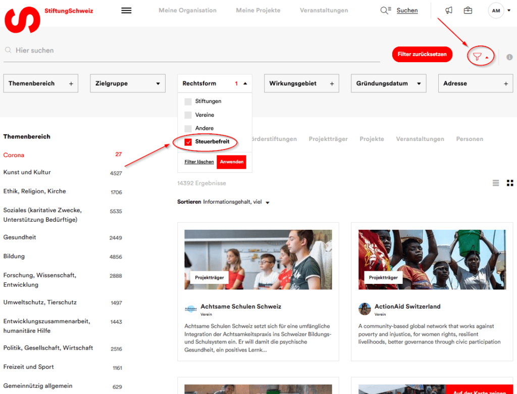 Die Steuerbefreiung ist ein wichtiges Signal für potentielle Spender*innen und Förderstiftungen. Ein prominentes, grünes Label kennzeichnet neu die Organisationen, die die Steuerbefreiung auf spheriq.ch bestätigt haben. Unter dem Filter „Steuerbefreit“ in unserer Suchfunktion erscheinen ebenfalls nur noch diese Organisationen. So erhöhen wir die Transparenz für Sie und für alle Geldgeber.