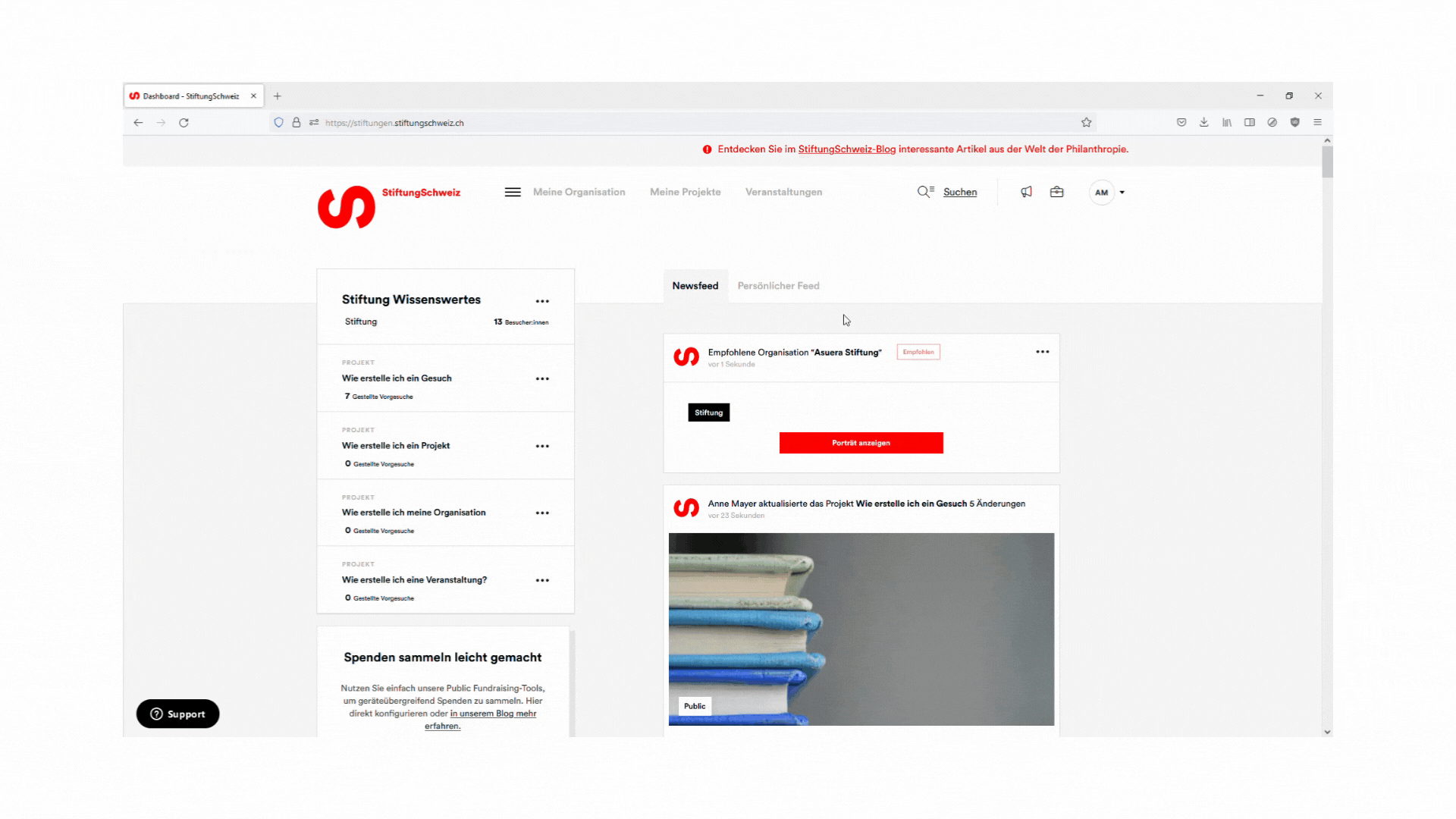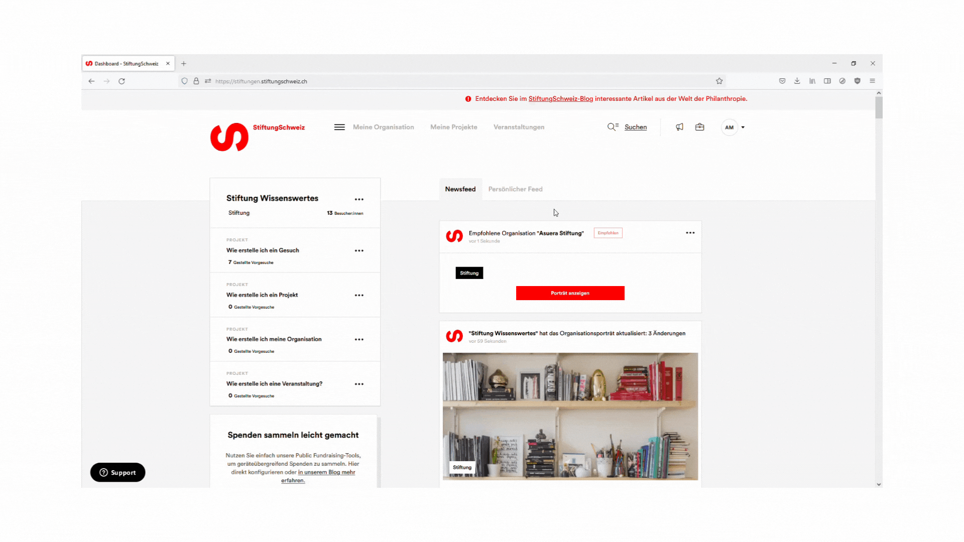 • Loggen Sie sich dafür einfach auf spheriq.ch ein, klicken Sie auf «Suchen» und wählen Sie ein Organisations- oder Projektporträt aus.