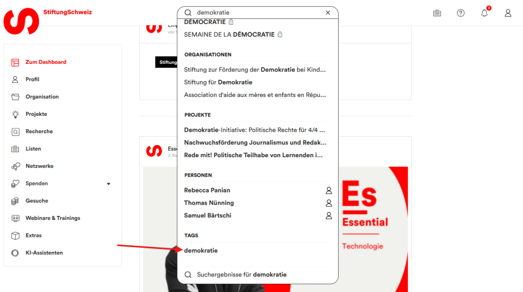Tag-Suche: Mit der Tag-Suche können Förderorganisationen ab sofort noch spezifischere Projekte ausfindig machen. Die Tags decken spezifische Themen ab, die nicht ausdrücklich in den Filtern der Suchegelistet sind. Durch die Eingabe eines Tags im zentralen Suchfeld werden alle Organisationen angezeigt, die sich mit dem gewählten Thema befassen. Die Tags machen es noch einfacher, relevante Kollaborationspartner zu ermitteln. Praktisch: Neben spannenden Förderpartnern werden auch Projekte oder Personen gezeigt, die ebenfalls mit einem bestimmten Tag verbunden sind.