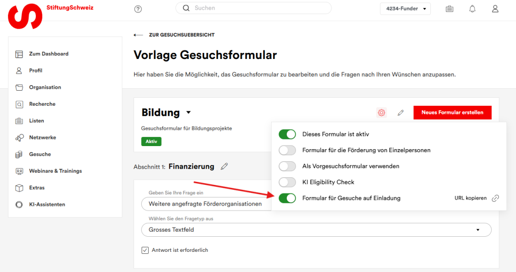 Mit der neuen Funktion von Spheriq haben Förderstiftungen nun die Möglichkeit, «Gesuche auf Einladung» zu empfangen. Stiftungen können gezielt jene Organisationen per Link zur Antragstellung einladen, die sie zuvor im Scouting identifiziert haben. Dieser Weg ermöglicht es der Stiftung, den Gesuchsweg nur für spezifische Projekte zu öffnen, die zu ihren Förderzielen passen und daher ihr Interesse geweckt haben. Um die Funktion auf spheriq.ch zu nutzen, aktiviert die Förderstiftung einfach beim entsprechenden Formular den Schalter für “Formular für Gesuche auf Einladung” und kann dann bequem den Link zum Formular kopieren und verschicken.