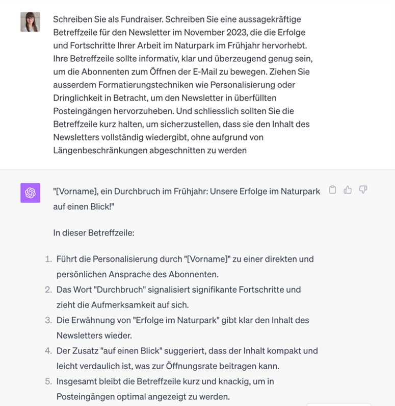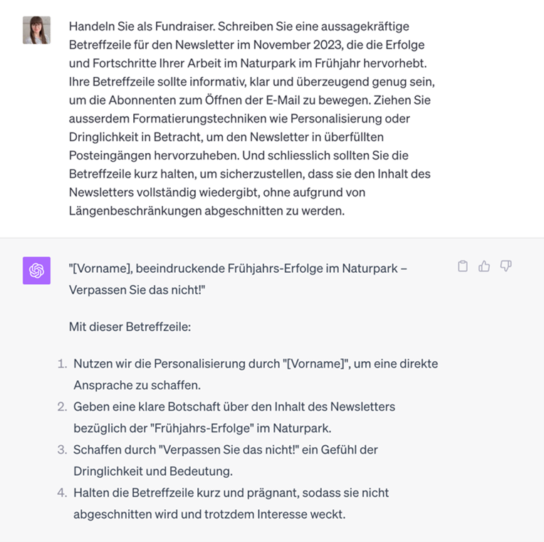 «Handeln Sie als Fundraiser. Schreiben Sie eine aussagekräftige Betreffzeile für den Newsletter im November 2023, die die Erfolge und Fortschritte Ihrer Arbeit im Naturpark im Frühjahr hervorhebt. Ihre Betreffzeile sollte informativ, klar und überzeugend genug sein, um die Abonnenten zum Öffnen der E-Mail zu bewegen. Ziehen Sie ausserdem Formatierungstechniken wie Personalisierung oder Dringlichkeit in Betracht, um den Newsletter in überfüllten Posteingängen hervorzuheben. Und schliesslich sollten Sie die Betreffzeile kurzhalten, um sicherzustellen, dass sie den Inhalt des Newsletters vollständig wiedergibt, ohne aufgrund von Längenbeschränkungen abgeschnitten zu werden.»