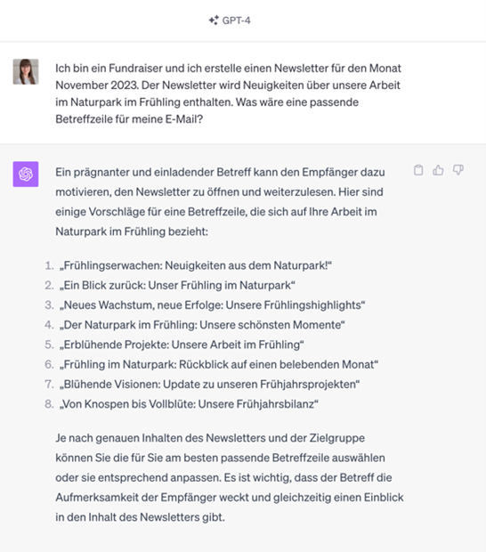 «Ich bin ein Fundraiser und ich erstelle einen Newsletter für den Monat November 2023. Der Newsletter wird Neuigkeiten über unsere Arbeit im Naturpark im Frühling enthalten. Was wäre eine passende Betreffzeile für meine E-Mail?»