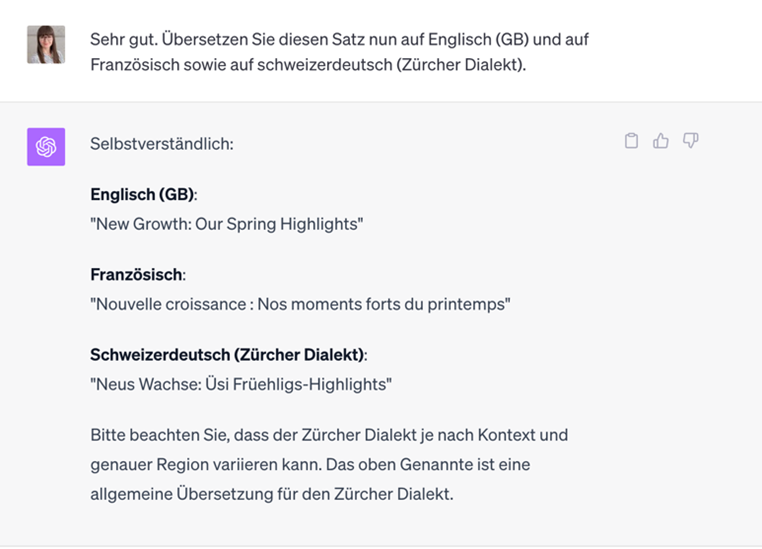 «Sehr gut. Übersetzen Sie diesen Satz nun auf Englisch (GB) und auf Französisch sowie auf schweizerdeutsch (Zürcher Dialekt).».