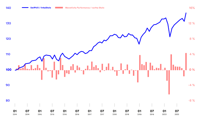 Mit +4,5% im November erfuhren die Wertschriftenanlagen von gemeinnützigen Organisationen ihren höchsten monatlichen Anstieg seit Beginn der Berechnungen des Swiss Philanthropy Performance Index (SwiPhiX) Ende 2013. Der Index der beiden Kooperationspartner Spheriq und Zürcher Kantonalbank erreichte damit gleichzeitig einen neuen Höchststand. Er steht nun bei 137,2 Punkten (Ende 2013: 100).