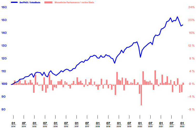 Im Quervergleich zeigt sich für den Monat März ein durchwachsenes Bild: Die Wertschriftenportfolios der gemeinnützigen Organisationen, die dem Performance-Index SwiPhiX zugrunde liegen, erzielten im März Renditen zwischen –1,1 % und 2,5 %. Im Durchschnitt betrug die Performance 0,5 %, sodass sich die seit Jahresbeginn aufgelaufenen Verluste auf 4,3 % verringerten. Die im Januar und Februar aufgelaufenen Kursverluste auf Aktien und Obligationen, getrieben durch die Erwartung steigender Zinsen, wurden damit bisher nicht wettgemacht.