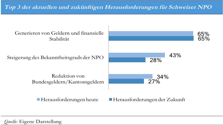 Es zeigt sich, dass insbesondere für kleine und mittelgrosse NPO der Rückgang von Kantons- und Bundesgeldern und die damit verbundene Abnahme der finanziellen Stabilität eine zunehmende Herausforderung darstellt. Für grosse Organisationen hingegen ist besonders die Steigerung des Bekanntheitsgrades und das damit verbundene Akquirieren von neuen Spendern in einem gesättigten Markt ein zunehmendes Problem.