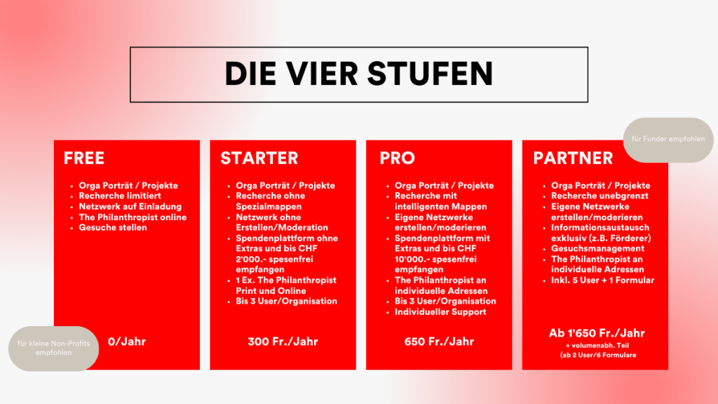 Unser neues Angebot spricht Nonprofits, Funders und Experts gleichermassen an. Nonprofits profitieren von modernen Fundraising-Methoden. Funders bauen Netzwerke auf und gestalten die Philanthropie aktiv mit. Auch Experts, ob als Einzelperson oder Vertreter:in einer Behörde oder Unternehmung, unterstützen gezielt Organisationen und Projekte.