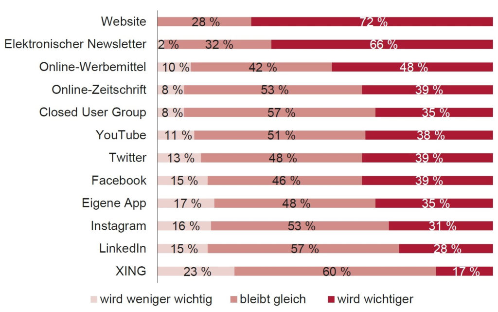 Auf die Frage hin, welche Kanäle für den einzelnen Verband eher an Bedeutung gewinnen resp. verlieren werden, herrscht ein gewisser Konsens: Für die Mehrheit der Befragten steigt primär die Bedeutung der eigenen Website sowie des elektronischen Newsletters an (vgl. Abb. 1). Damit erwarten sie einen weiteren Bedeutungszuwachs derjenigen Kanäle, die ihre Onlinekommunikation bereits heute massgeblich prägen. Bei vielen anderen digitalen Medien erwarten sie tendenziell ebenfalls einen Bedeutungszuwachs, in welchem Ausmass ist aber meist noch unklar. Einzig beim Business-Netzwerk XING vermuten die befragten Organisationen eher einen Rückgang.