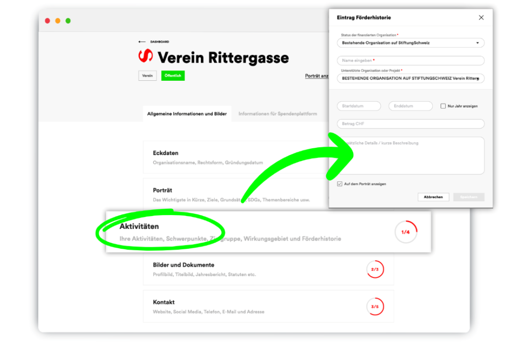 Aus Sicht der Nutzer:innen erfolgt die Erfassung der Förderchronik benutzerfreundlich und intuitiv. Ein paar Klicks genügen, und die Organisation präsentiert sich potenziellen Förderern in einem vertrauenswürdigen Licht. Das spart Zeit und erlaubt es Nonprofits, sich auf das Wesentliche zu konzentrieren: ihre Arbeit mit Impact.