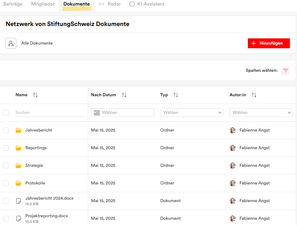 Als Admin und Moderator:in eines Netzwerks können Sie im Tab “Dokumente” beliebig viele Ordner erstellen und so eine Struktur vorgeben. Dokumente, welche von Ihnen oder Netzwerkmitgliedern direkt hochgeladen oder via Beitrag hinzugefügt werden, erscheinen hier und können sauber strukturiert abgelegt werden, wie man es aus dem eigenen Dateisystem kennt. Das erleichtert die Kollaboration – sei es in der eigenen Organisation, wie auch organisationsübergreifend. Die Dokumentenablage unterstützt zum Beispiel: