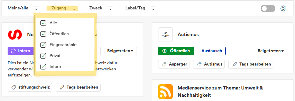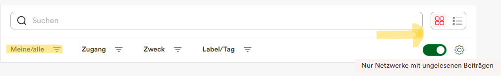 Der Filter “Meine/alle” stellt sicher, dass Sie auf kürzestem Weg zu denjenigen Netzwerken gelangen, in welchen Sie bereits Mitglied sind. Interessiert es Sie, welche zusätzlichen Netzwerke es gibt, denen Sie beitreten können, stellen Sie den Filter auf “Offene Netzwerke (Beitritt möglich)” ein. Indem Sie den Switcher (Schalter) nach rechts und damit auf Grün einstellen, sehen Sie auf einen Blick am roten Punkt, in welchen Netzwerken ungelesene Beiträge auf Sie warten. Zudem haben Sie die Wahl zwischen der Kachel- und der Listenansicht. In der Listenansicht werden zusätzlich bis zu drei der neusten Netzwerkbeiträge als Vorschau angezeigt.