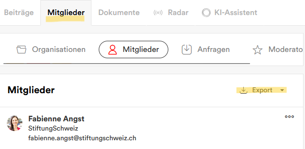 Sobald Sie Mitglied eines Netzwerks sind, sehen Sie im Tab “Mitglieder” die Namen der anderen Netzwerkmitglieder. Falls diese für eine Organisation arbeiten und es beim Netzwerkeintritt angegeben haben, sehen Sie diese Infos zusätzlich. Für Admins und Moderator:innen eines Netzwerks besteht hier zudem die Möglichkeit, eine Liste der Mitglieder (.csv oder .xls) zu exportieren.