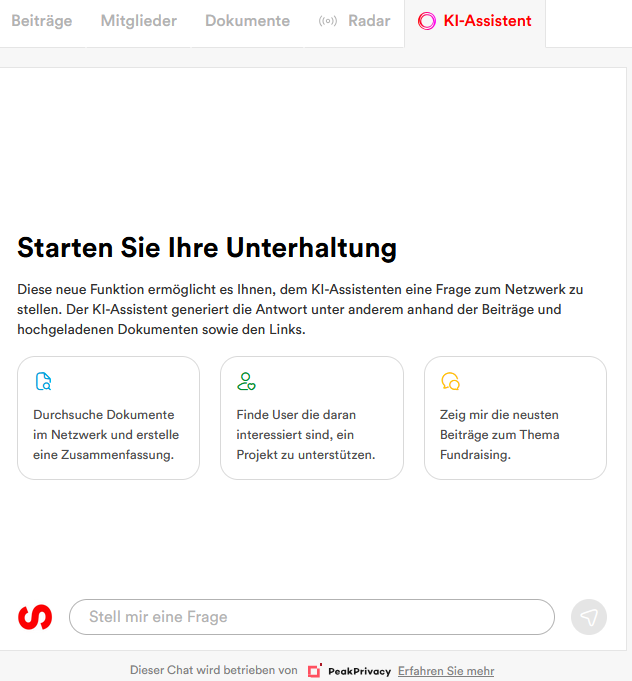Der integrierte KI-Assistent,analysiert hochgeladene Dokumente sowie Inhalte aus Beiträgen und hilft Ihnen dabei, gezielt relevante Inhalte zu identifizieren – ganz ohne langes Suchen. Nutzen Sie die Vorteile von KI und lassen Sie sich den Assistenten von unserem Support freischalten.