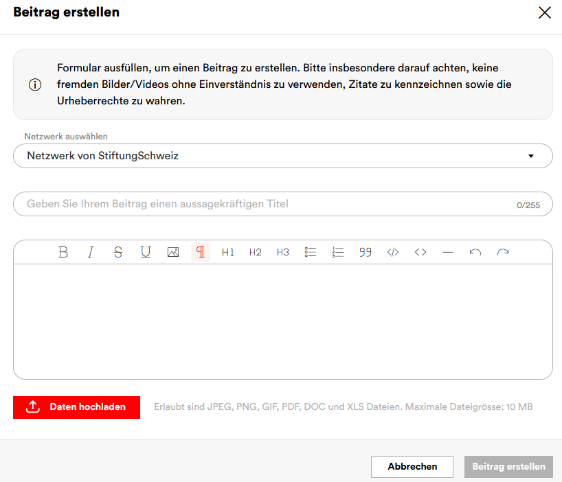 Klicken Sie in einem Ihrer Netzwerke auf den Button «Beitrag erstellen». Geben Sie einen aussagekräftigen Titel ein. Sie können optional Text, Links, Videos, Bilder oder Dateien einfügen. Anhänge werden automatisch in den Tab “Dokumente” übernommen und gekennzeichnet.