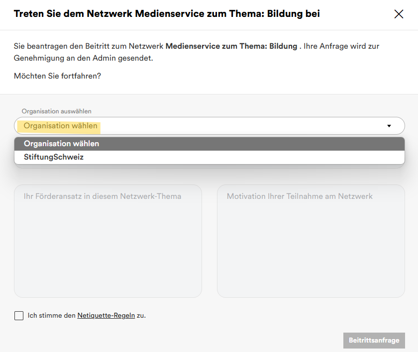 4. Wählen Sie den Namen Ihrer Organisation aus, sofern Sie einer angehören und mit dieser auf spheriq.ch verknüpft sind. Achtung! Die Organisation ist nur beim Eintritt in ein Netzwerk anwählbar und kann danach nicht mehr geändert werden.