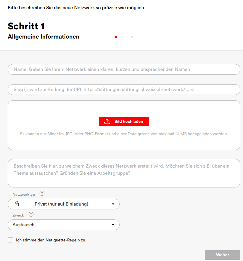 4. Button «Neues Netzwerk erstellen» drücken und Informationen ausfüllen. Tipp: Geben Sie Ihrem Netzwerk einen klaren, kurzen und ansprechenden Namen und beschreiben Sie die Gründungsidee dieses Netzwerks im vorgesehenen Feld.