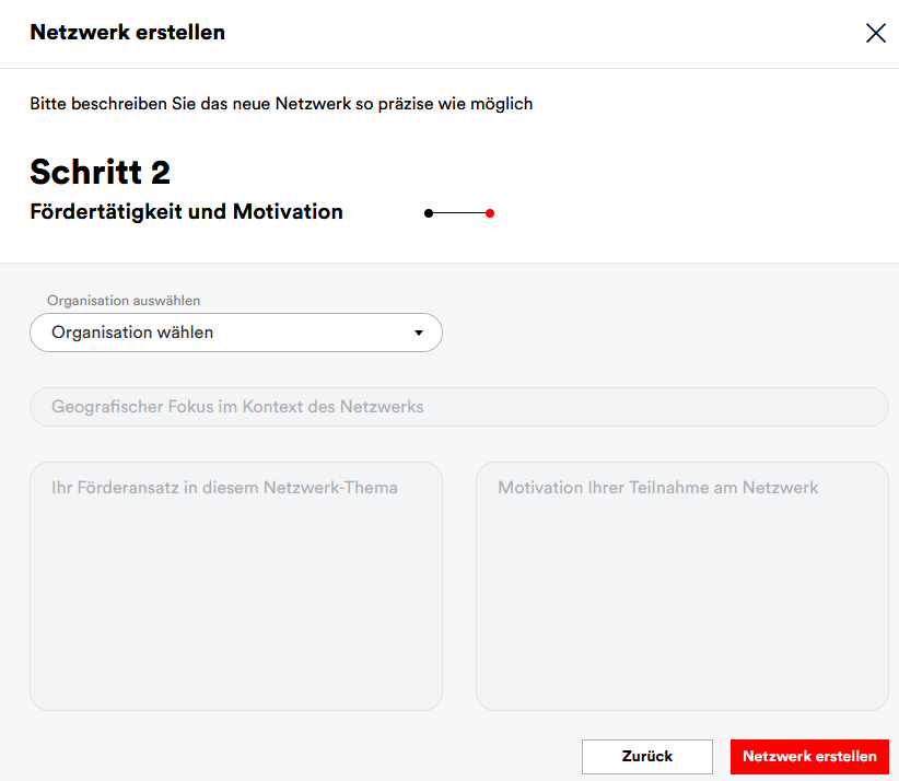 Optional: Für gewisse Netzwerke kann es Sinn machen, optionale Details zum geografischen Fokus, den Förderansatz und Ihre Motivation anzugeben. Diese Angaben sind nur für die Mitglieder Ihres Netzwerks sichtbar. Benötigen Sie diese Felder nicht? Lassen Sie sie einfach leer.