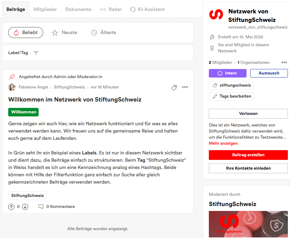 Damit Mitglieder Ihres Netzwerks besonders relevante Beiträge schneller zur Hand haben, können diese vom Admin angeheftet werden. Angeheftete Beiträge behalten Ihre Stellung zuoberst in der Beitragsreihenfolge.