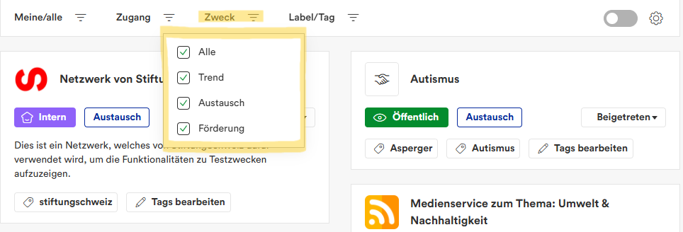 Um diese unterschiedlichen Einsatzmöglichkeiten klar zu kennzeichnen, haben wir drei Zweck-Kategorien eingeführt. So sehen Sie auf einen Blick, welchem Ziel ein Netzwerk dient und wie es genutzt werden kann.