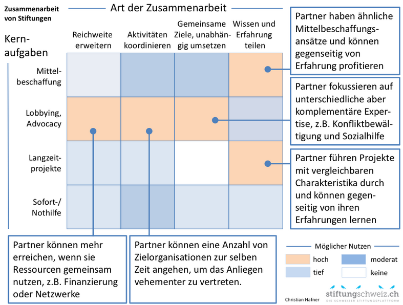 Unterstützt mit qualitativen und quantitativen Techniken kann der Stiftungsrat so den potentiellen Nutzen einer Zusammenarbeit zu jeder Aufgabe analysieren. Selbstverständlich kommen nur Bereiche mit hohem Potenzial ernsthaft als Kandidaten für eine Zusammenarbeit in Frage; der Rest sollte in Ruhe gelassen werden.