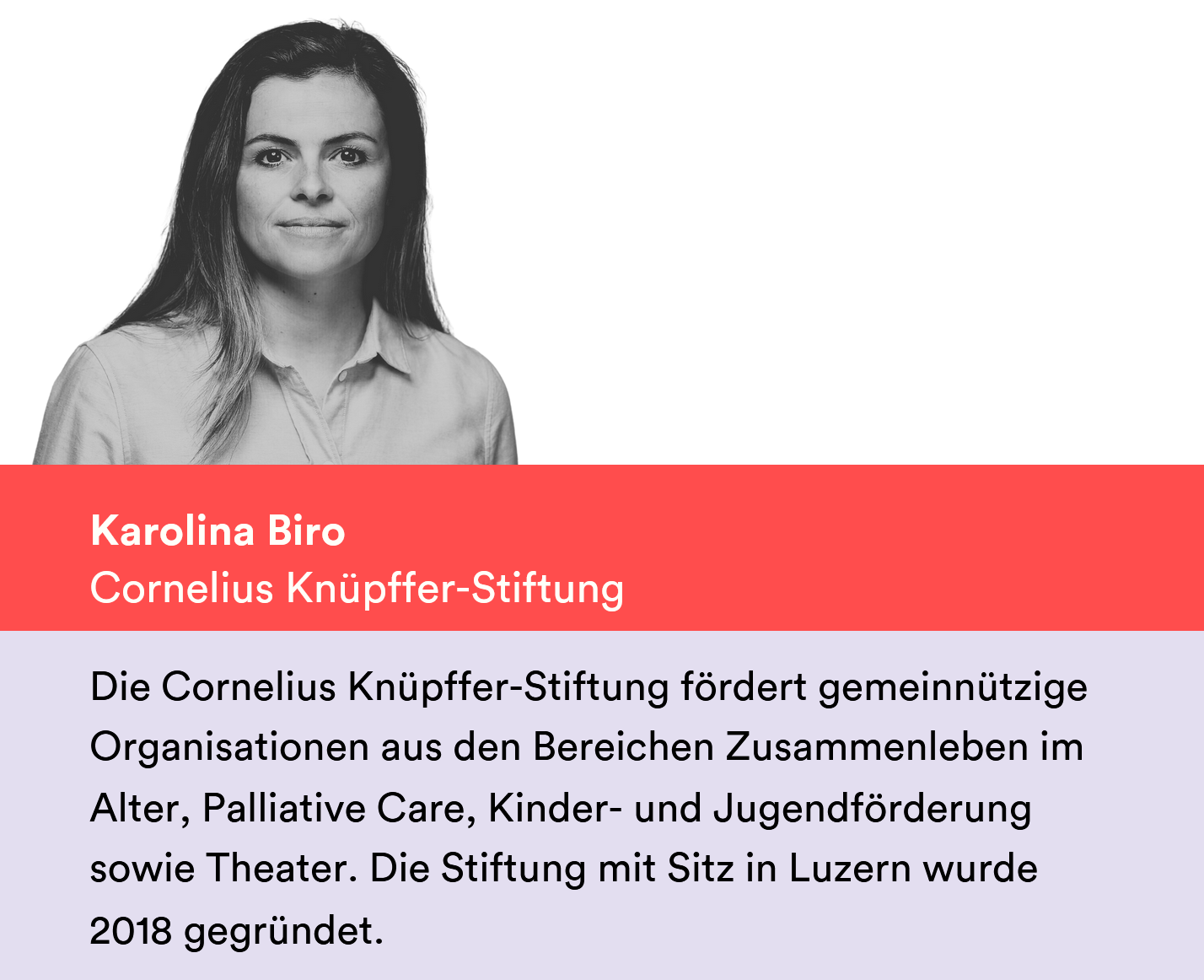 Karolina Biro, Geschäftsführerin Cornelius Knüpffer-Stiftung: Für uns war die Entscheidung, auf das Tool umzusteigen, relativ einfach. Unsere Stiftung und damit auch das Gesuchsmanagement sind bereits seit mehreren Jahren digitalisiert. Nebst der neuen Möglichkeit, Gesuche über das Tool von Spheriq einzureichen, können Gesuchsteller:innen das auch über ein Online-Formular auf unserer Website machen. So können die Nonprofits selbst entscheiden, welcher Weg für sie am einfachsten ist. Unser Ziel ist es, das Fundraising für Nonprofits möglichst niederschwellig zu gestalten, damit sie sich auf ihre eigentliche Arbeit konzentrieren können