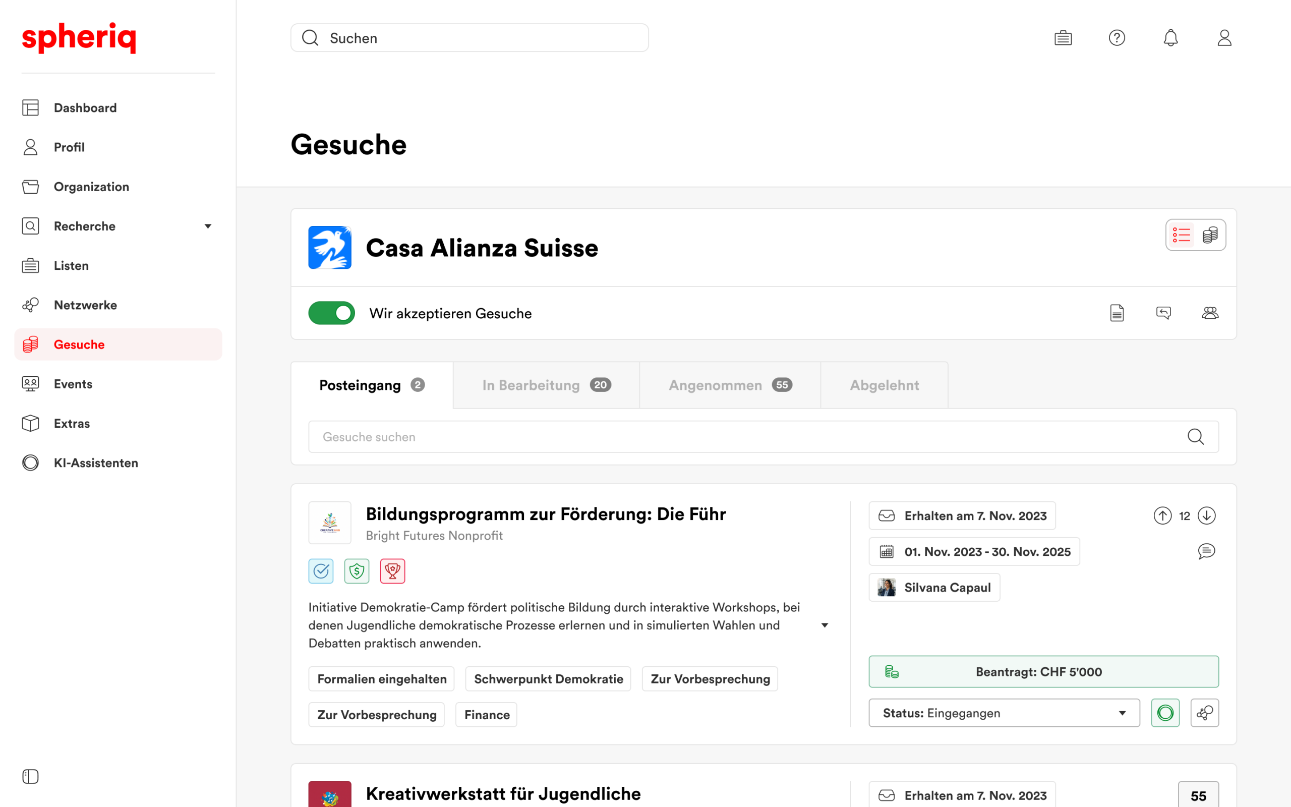 The Applications tool enables funders to receive and process incoming applications, while nonprofits can send their projects directly to potential funders. Both sides maintain an overview, track progress and see in real time which funds have been applied for or approved.