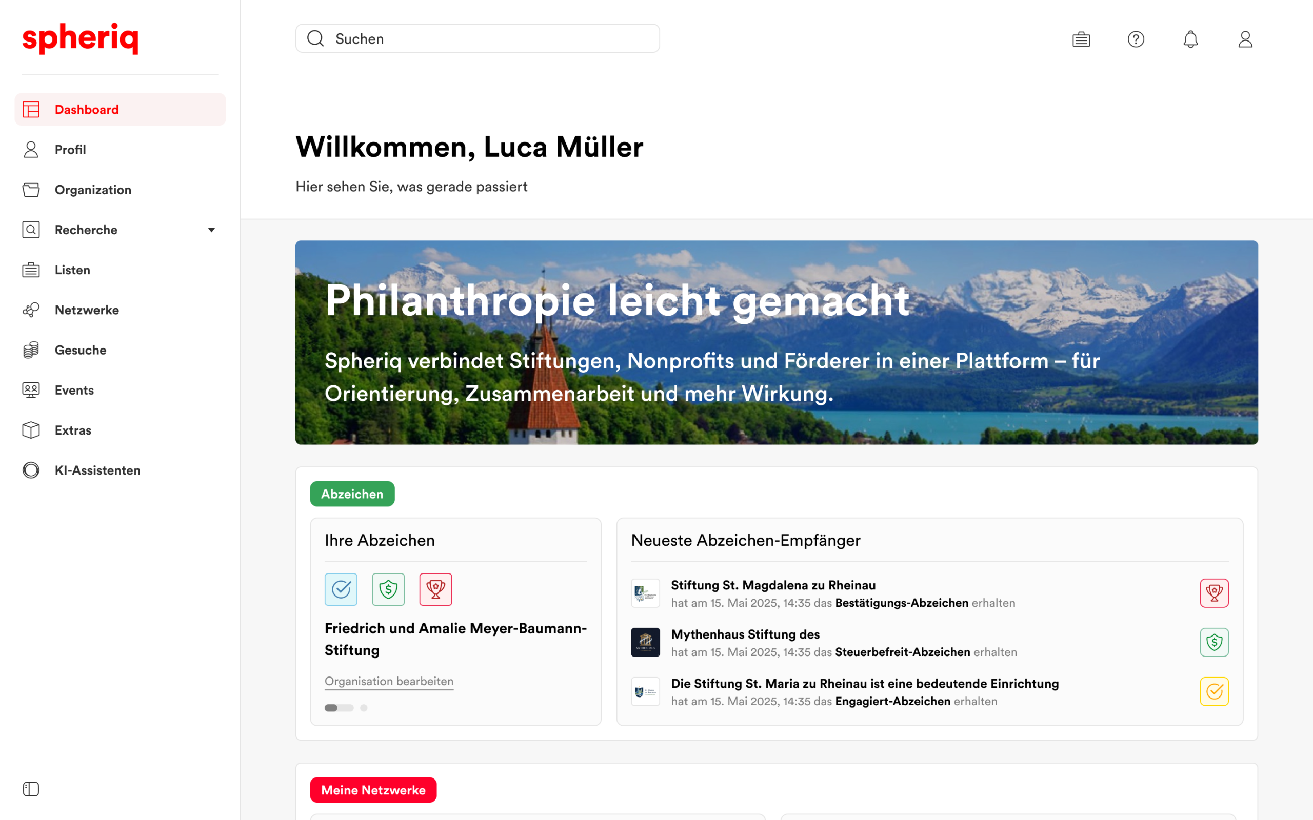 The dashboard is your personal hub on Spheriq. It bundles everything important: your organization’s badges, current activities, upcoming events, selected networks, highlighted lists, blog posts, success stories and webinars. One glance is all it takes to see what’s happening and where action is needed.
